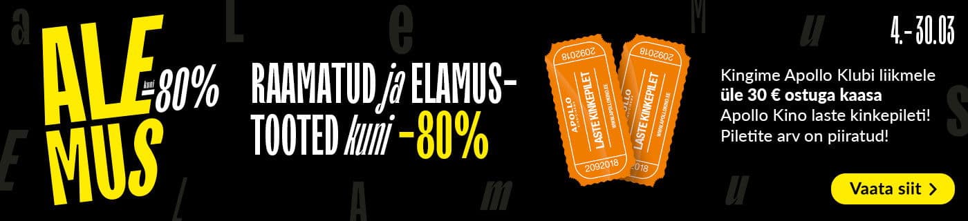 • Kampaaniast saavad osa kõik Apollo Klubi kliendid, kes sooritavad perioodil 4.-30.03.2026 meelepärases Apollo raamatupoes või e-poes ostu, mille kogusummaks on vähemalt 30 €. Allalaetavate (e-kinkekaart ja e-raamat) toodete tellimuste puhul palume kliendil pöörduda info@apollo.ee • Kampaania kehtib Ülemiste, Kristiine, Rocca al Mare, Solarise, Viimsi, Lasnamäe Centrumi ja Järve keskuse, Haapsalu Kaubamaja, Pärnu Kaubamajaka, Pärnu Keskuse, Tartu Lõunakeskuse, Kaubamaja, Kvartali keskuse, Rakvere Kroonikeskuse, Viljandi Uku, Keila ja Saaremaa Auriga keskuste Apollodes kohapeal ja e-poes www.apollo.ee. • Kinkepileti kättesaamiseks tuleb pöörduda pärast ülalmainitud meelepärases Apollo raamatupoes vähemalt 30 € ostu raamatupoe tavakassasse, kus väljastatakse kliendile üks tasuta Apollo Kino laste kinkepilet. • Kinkepileteid väljastatakse vaid sama päeva ostu puhul. • Kampaania kehtib ühekordse ostu puhul. • Kampaania ei rakendu klientidele, kes ei ole Apollo Klubi liikmed. • Kampaanias osalemiseks peab klient olema Apollo Klubi liige ja ostu hetkel registreerima enda klubilisuse staatuse või hakkama enne ostu sooritamist Apollo Klubi liikmeks. • Kampaania kehtib kuni 30.03.2026 või kuniks kinkepileteid jagub. • Kingituseks saadud Apollo Kino laste kinkepilet on väärtusega kuni 10 € ning see kehtib aprillikuu vältel, 1.-30.04.2026.