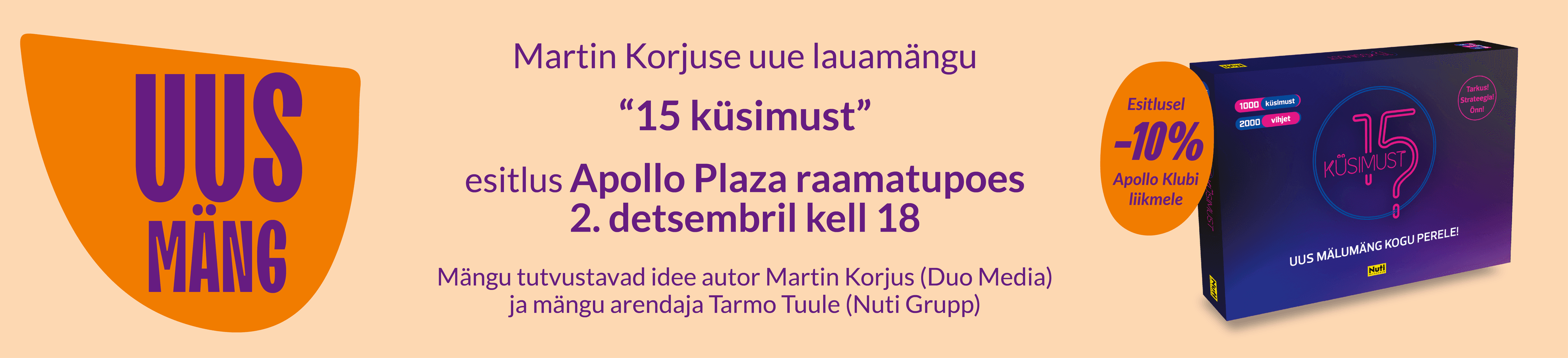 Oled oodatud teisipäeval, 2. detsembril kell 18.00 lauamängu "15 küsimust" esitlusele Apollo Plaza raamatupoodi! Mängu tutvustavad idee autor Martin Korjus (Duo Media) ja mängu arendaja Tarmo Tuule (Nuti Grupp).