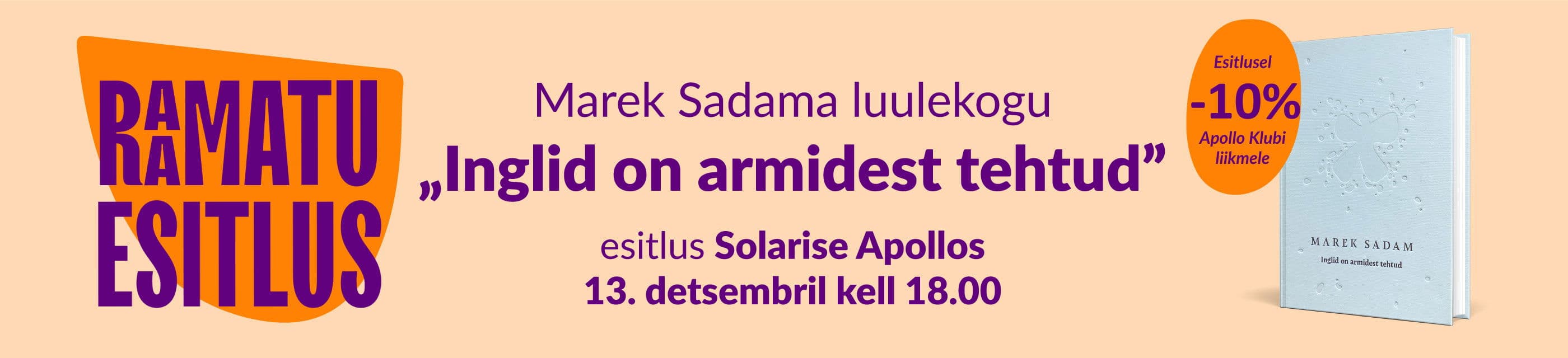 13.12 kell 18 toimub Marek Sadama luulekogu „Inglid on armidest tehtud“ esitlus.
