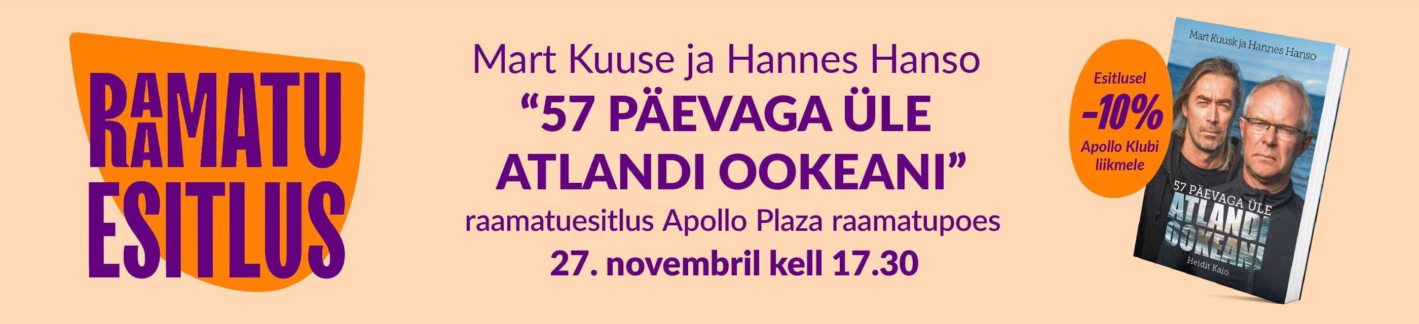 Ootame sind 27. novembril kell 17.30 Apollo Plaza raamatupoodi Mart Kuuse ja Hannes Hanso raamatu "57 päevaga üle Atlandi ookeani" esitlusele.
