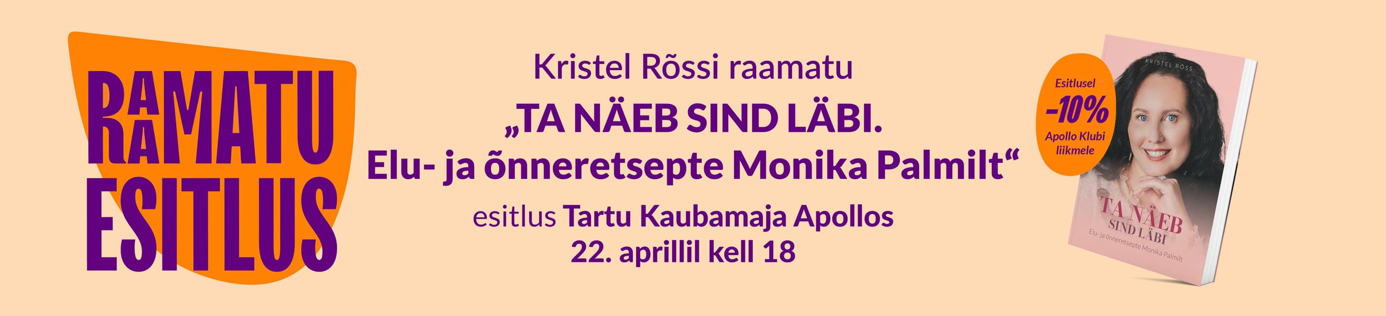 Ootame kõiki huvilisi 22.04 kell 18 Tartu Kaubamaja Apollosse Kristel Rõssi raamatu „Ta näeb sind läbi. Elu- ja õnneretsepte Monika Palmilt“ esitlusele. Selgeltnägija Monika Palmiga vestleb raamatu autor. Kohapeal teeme üheskoos rõõmutunde äratamise harjutuse.