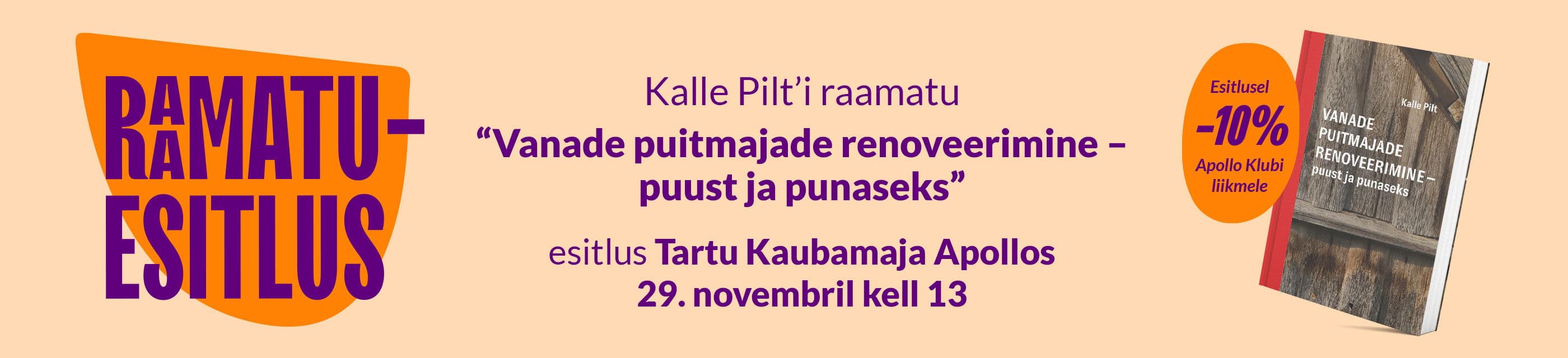 Ootame sind 29.11 kell 13 Tartu Kaubamaja Apollosse raamatu „Vanade puitmajade renoveerimine – puust ja punaseks“ esitlusele. Raamatut esitleb autor Kalle Pilt.