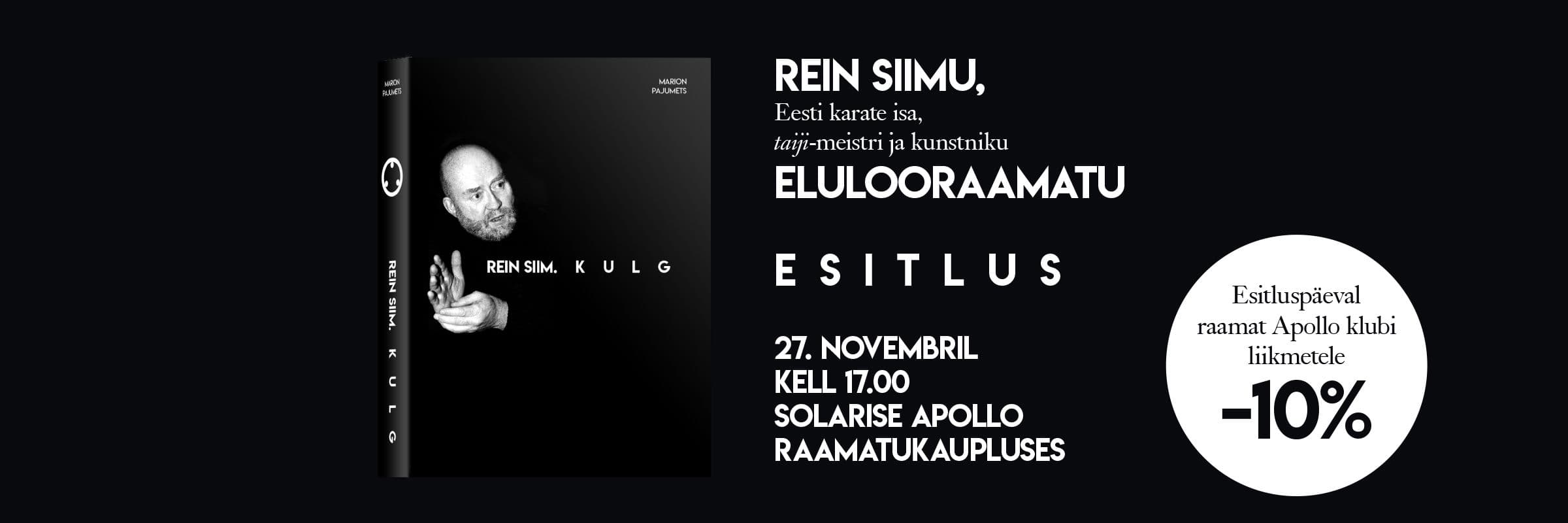 Ootame sind 27.11 kell 17.00 Solarise keskuse Apollo raamatukauplusesse "Rein Siim. Kulg" raamatuesitlusele.
