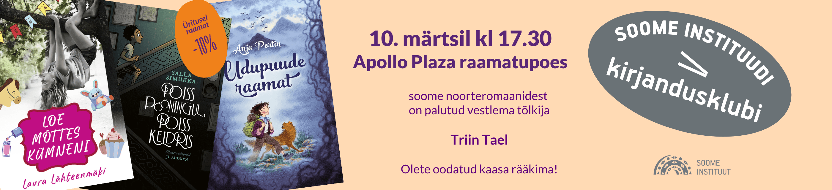 Soome Instituudi kirjandusklubi Tallinnas jätkab Apollo Plaza raamatupoes 21. aprillil, kus tõlkija Triin Taelaga tuleb juttu soome noorteromaanidest.