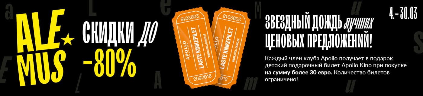ALEMUS скидки до -80% ЗВЕЗДНЫЙ ДОЖДЬ лучших ЦЕНОВЫХ ПРЕДЛОЖЕНИЙ! Каждый член клуба Apollo получает в подарок детский подарочный билет Apollo Kino при покупке на сумму более 30 евро. Количество билетов ограничено!